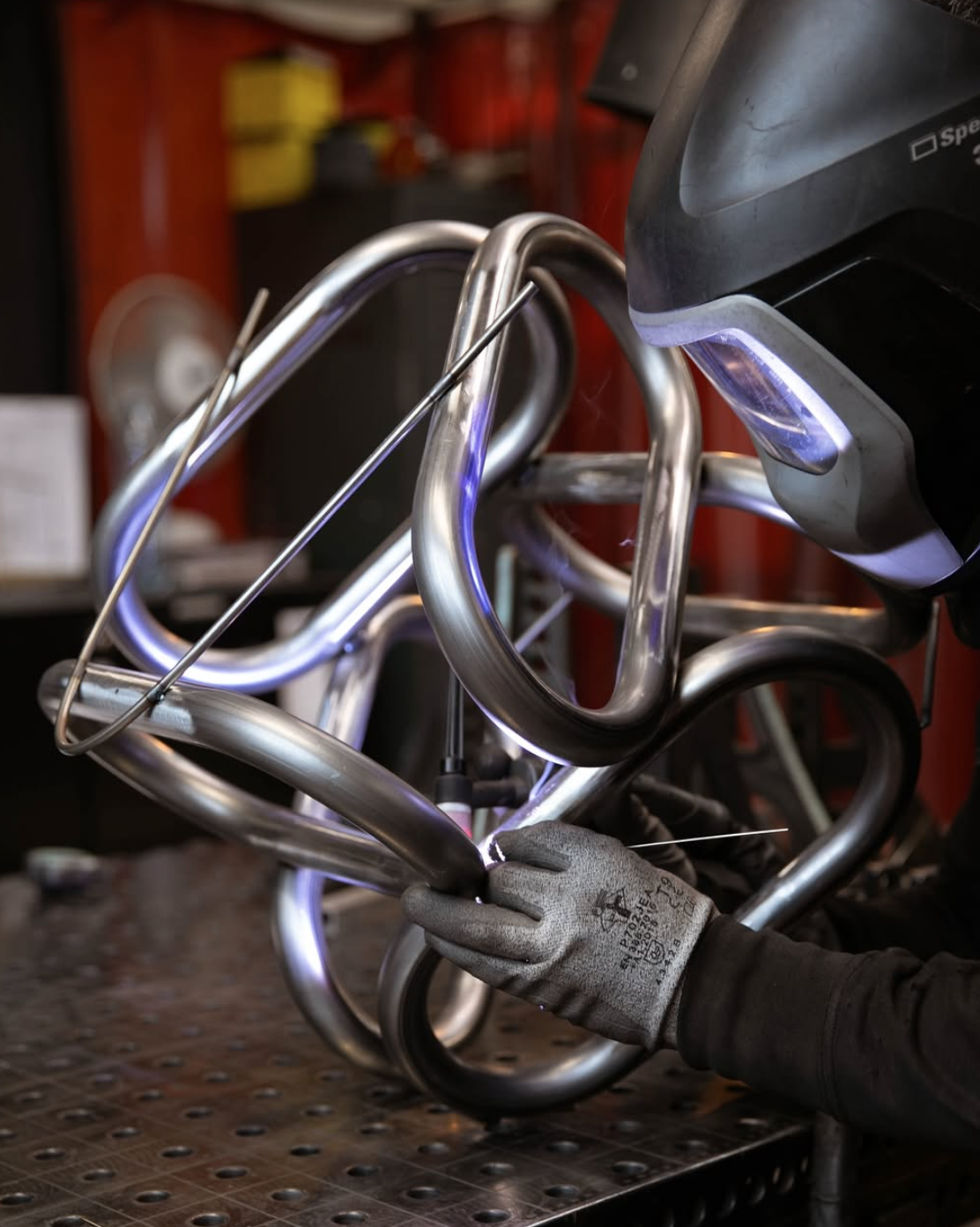 Thermolaquage (peinture pulvérisée à la poudre sur du métal puis polymérisée) dans les ateliers de l’entreprise CFT Industries
