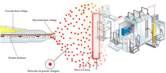 schéma du principe physique du dépôt de poudre électrostatique sur lequel repose le thermolaquage. La poudre chargée négativement dans le pistolet est projetée sur des pièces métalliques conductibles puis polymérisée à haute température