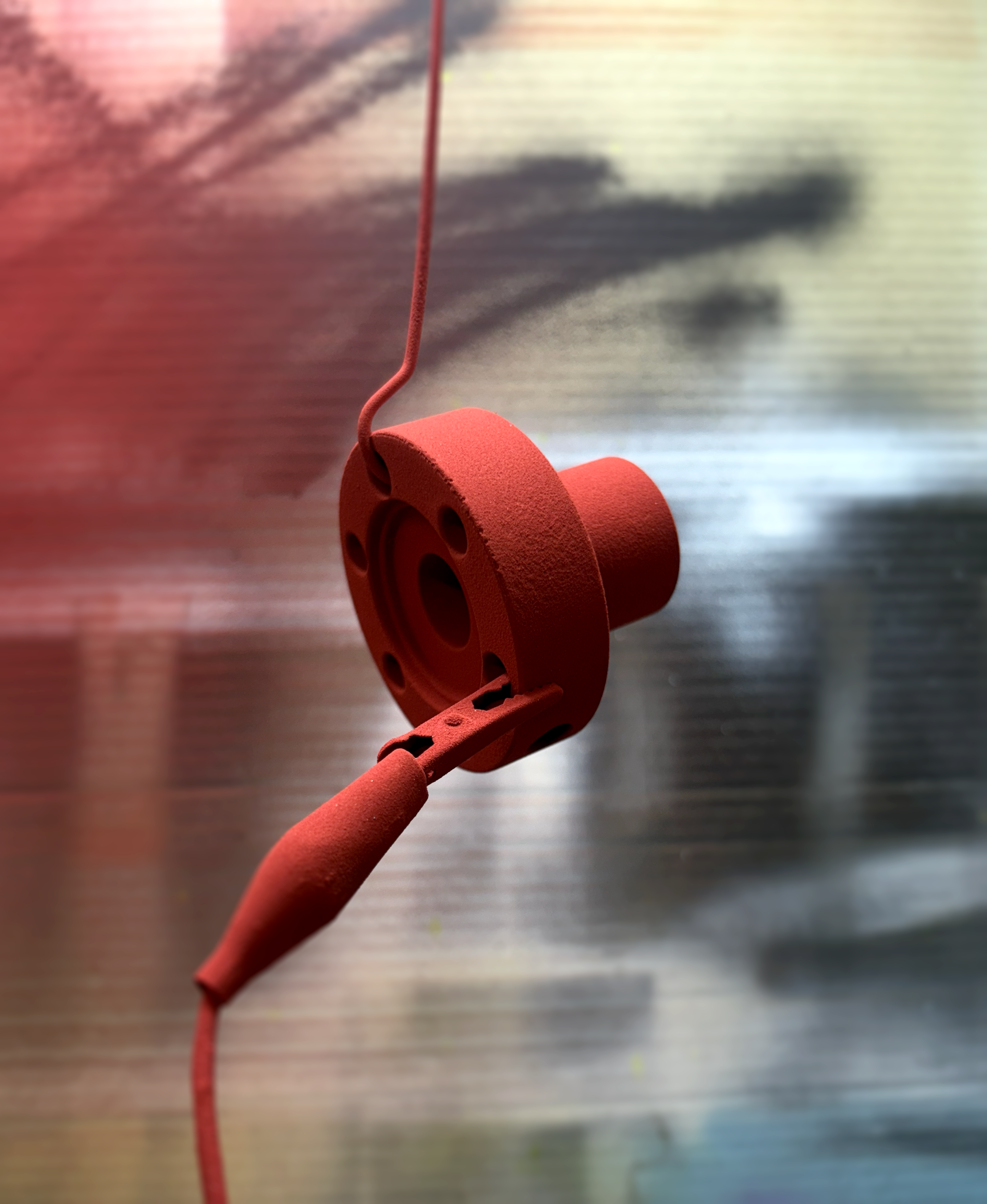 Avec l’apparition du thermolaquage, la laque voit le jour dans le secteur de l’industrie, l’architecture et plus généralement l’extérieur. Bien que le thermolaquage ait de la marge avant de répondre aux besoins d’une technique de laquage parfaite, il permet d’orienter l’exigence sur certains points. Cette technique de propulsion de poudre permet notamment de s’appliquer dans les moindres recoins des supports puisqu’elle marche par phénomène d’éléctrostatiticté. En effet, le thermolaquage s’effectue sur des pièces conductibles comme les métaux, sur laquelle on vient projeter une poudre de pigment. Cette poudre est rendue électrostatique par un compresseur d’air et un boîtier qui envoie des charges dans le réservoir à poudre. Celle-ci est ensuite projetée avec différents degrés de pression sur les supports métalliques et vient se déposer sur toute la pièce de manière uniforme. La pièce est reliée à une électrode pour la rendre conductible (soit chargée négativement). Ainsi, si la pièce est un support conductible, la poudre peut venir se déposer de manière homogène dans les moindres recoins de la pièce. Contrairement au pistolet de laque chimique qui rend inaccessible le laquage de certains galbes, le pistolet de thermolaquage permet à la couleur de défier les lois de la gravité pour aller chercher l’exigence d’un revêtement uniforme ultra solide. La deuxième étape clé du thermolaquage est la cuisson qui permet à la poudre déposée sur le métal de se polymériser. Chaque petite particule de poudre aimantée au métal fond pour former une coque lisse brillante et solide qu’on ne connaît maintenant que trop bien. La cuisson est à faible puissance et de courte durée, rendant cette technique accessible même aux particuliers. C’est ainsi qu’en quelques minutes, avec un four alimentaire récupéré, un pistolet de seconde main et un compresseur d’air, j’ai pu “laquer” des pièces d’acier d’une ferraille pour les maquiller et leur redonner vie. Même le pas de vis fut entièrement recouvert, comme si l’objet avait été placé dans un bain de couleur. Bien que le résultat après cuisson soit un peu plus terne qu’un vernis poncé de laque chimique, je me suis découvert un certain plaisir à domestiquer un revêtement habituellement réservé aux usines et industries d’extérieur.
