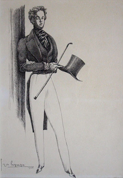 Dessin original de Georges Lepape daté de 1948 représentant un dandy, vraisemblablement le célèbre Brummell. En 1948, Georges Lepape réalise des illustrations sur l'élégance masculine dont une partie paraît dans la revue Plaisir de France.Cette composition est reproduite dans le programme du bal des arts de juin 1948.